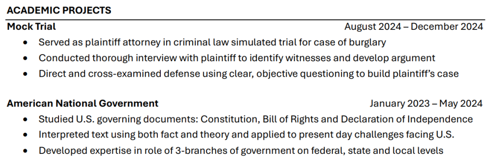 - Include 1-3 class projects related to your career goals or where you fine tuned any hard or transferable skills
