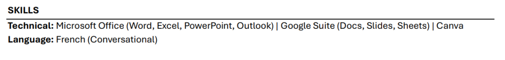 - Include any hard, technical skills here – no general, transferable skills